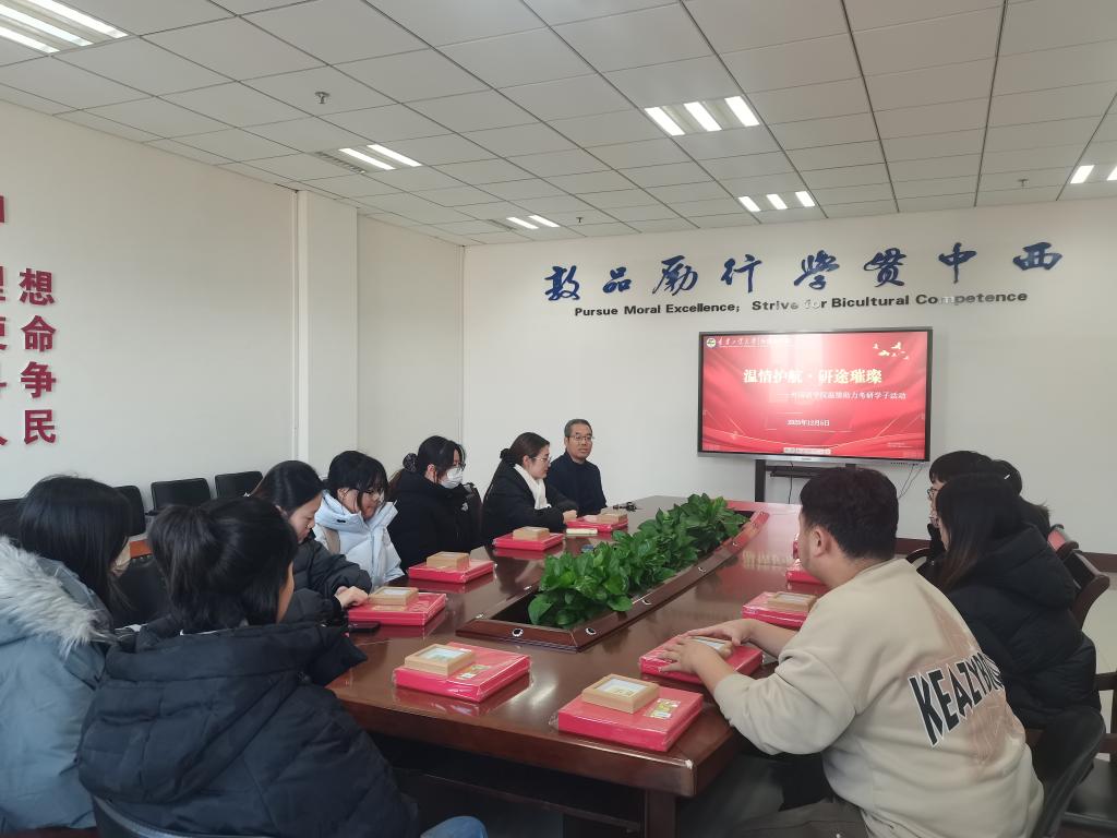 12月5日,外国语学院在图书馆711举办“温情助力学子考研”活动,学院院长刘杰辉、党总支副书记兼副院长范旭参加了本次活动。